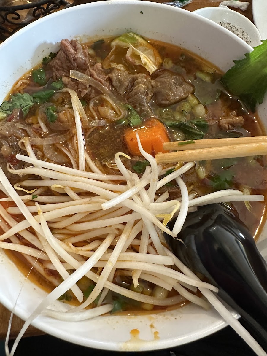 One of the highlights at Phở Duyên is the chicken pho, widely regarded as the best in the city. The dish is celebrated for its generous portion of tender, juicy chicken, and the broth, which strikes a perfect balance between sweet, salty, savory, and umami flavors. The chicken pho is complemented by a flavorful chili oil that adds a smoky heat without overpowering the dish. The beef noodle soup, another standout, offers a rich broth that brings to mind the complex flavors of birria consomé, paired with springy egg noodles that add to the dish's satisfying texture.
